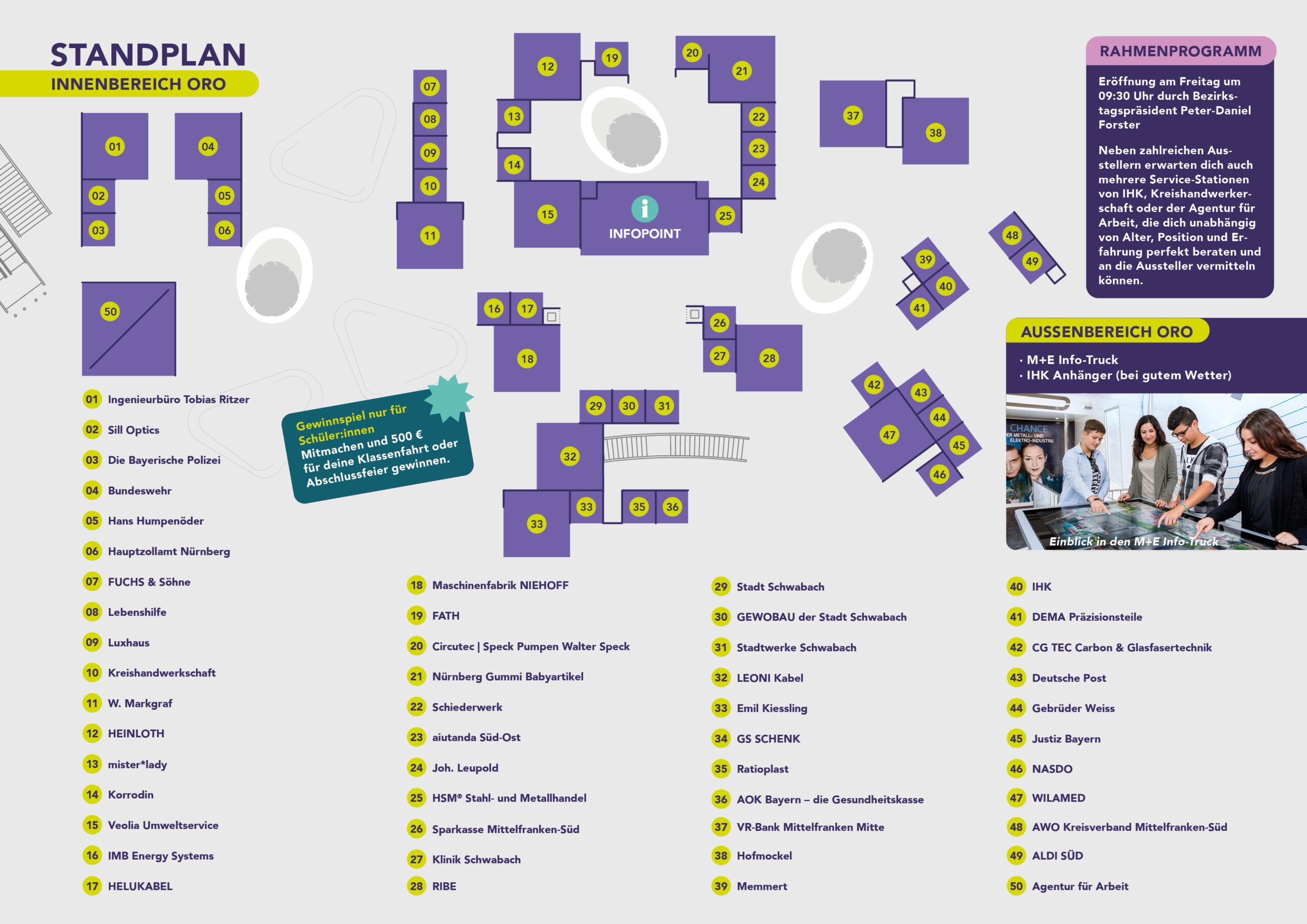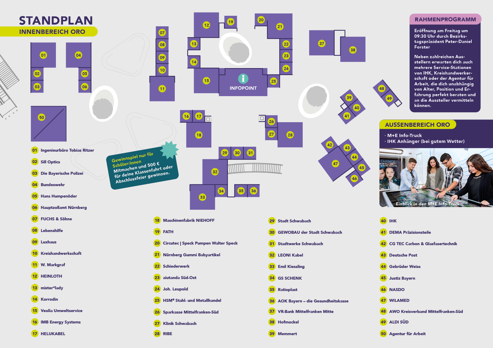 Neben zahlreichen Ausstellern erwarten dich auch mehrere Service-Stationen von IHK, Kreishandwerkerschaft, der Agentur für Arbeit oder von unserer Messe, die dich unabhängig von Alter, Position und Erfahrung perfekt beraten und an die Aussteller vermitteln können. Außerdem findest du direkt vor der ORO den M+E Truck der Metallindustrie, der spannende Einblicke in Berufe von morgen vermittelt.